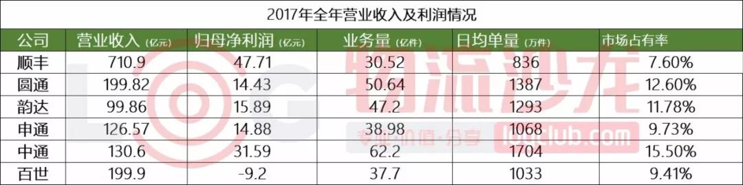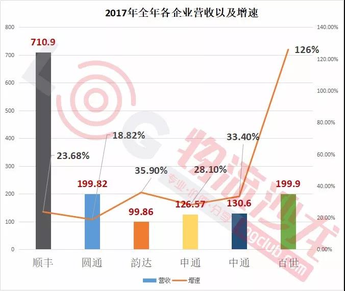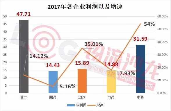 我們可以從營收增速來看看各家企業表現力。具體來看,百世第一,增幅高達126%,其次是韻達、中通、申通,分別是35.9%、33.4%、28.1%,都高于郵政局公布的2017年全年快遞收入增長速度(2017年行業增速為24.7%)。