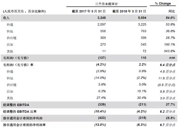 5月10日,百世集團(tuán)公布2018年第一季度未經(jīng)審計(jì)財(cái)務(wù)業(yè)績:一季度總收入50.04億元人民幣,同比增長54%;毛利潤1.1億元人民幣,與去年同期相比提升6.4%。